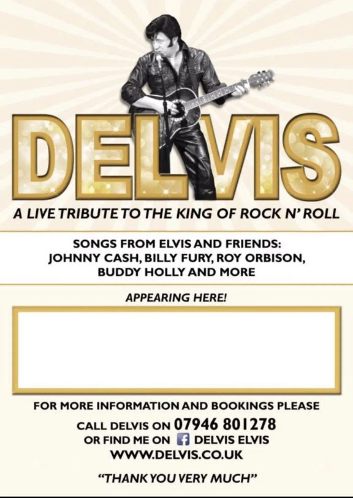 Join us at the Billericay Constitutional Club on the 29th of July 2023 for an electrifying evening of live music and nostalgia. Delvis, the sensational live tribute to the king of rock 'n' roll, will be taking the stage at 8:30 pm, transporting you back to the golden era of Elvis Presley and his legendary friends. With an extraordinary repertoire that includes iconic hits from Johnny Cash, Billy Fury, Roy Orbison, Buddy Holly, and many more, Delvis promises an unforgettable night filled with timeless melodies and infectious energy. Don't miss this opportunity to relive the magic of rock 'n' roll's greatest era at the Billericay Constitutional Club.